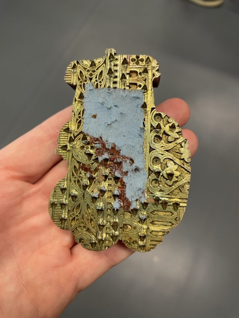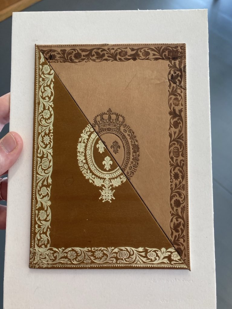 Ces objets sont donc étonnants à double titre : ils sont d’une part la preuve matérielle que le remploi peut aussi concerner des matériaux potentiellement réutilisables sous d’autres formes, comme le métal ; et ils incarnent d’autre part la diversification de la dorure qui s’opère au cours du xixe siècle : les motifs utilisés et gravés ne cherchent plus exclusivement à suivre les évolutions stylistiques, ils s’efforcent aussi d’imiter des styles anciens afin de restituer des décors de périodes révolues dans le cadre d’une patrimonialisation progressive des documents écrits. S’il est vrai que rien ne se perd, les transformations qui jalonnent la matérialité des objets du passés peuvent être lues entre les lignes et en retournant les objets, bref, en les observant sous toutes les moulures, sous toutes les coutures.