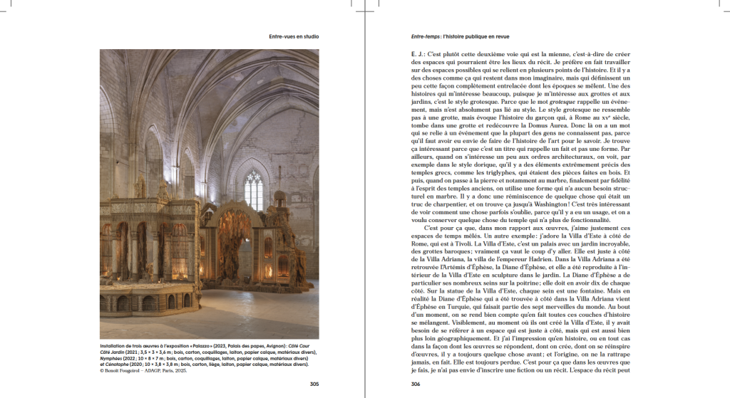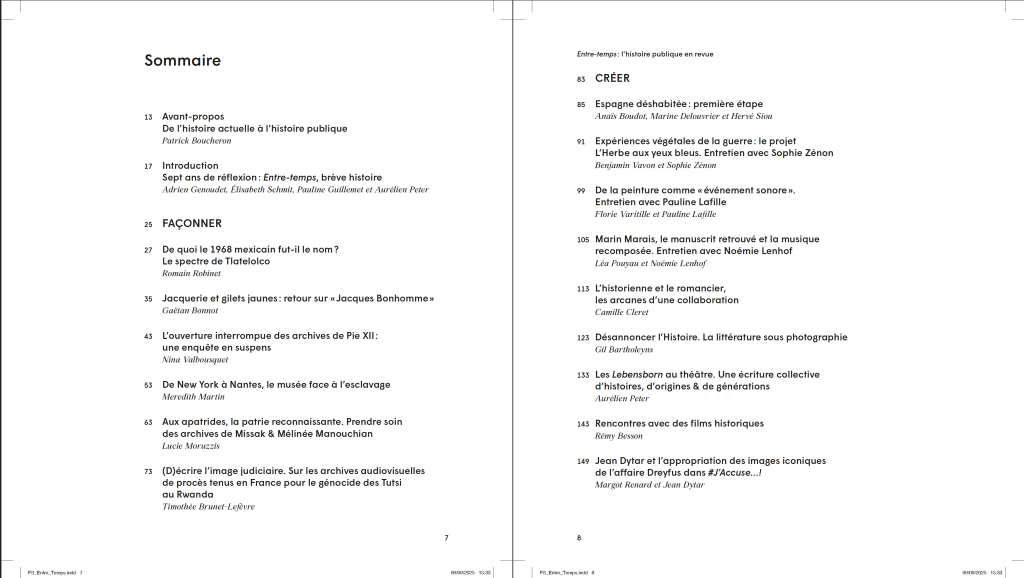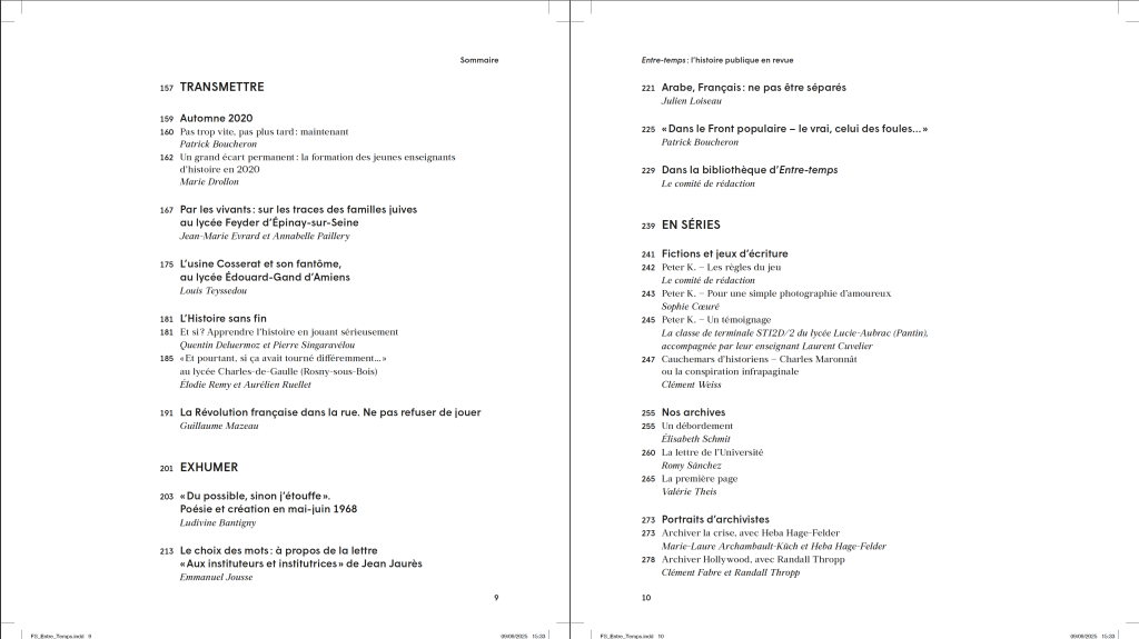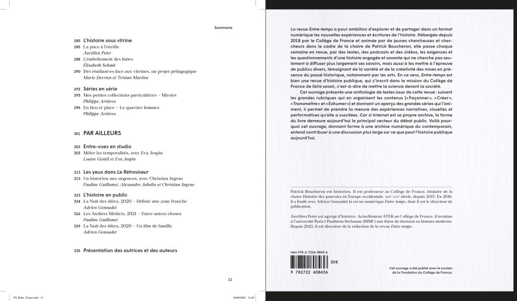 À vos librairies ! Pour sa rentrée d'octobre 2025, Entre-Temps sort de ses espaces numériques de publication avec un livre papier, Entre-temps : l’histoire publique en revue. 46 textes publiés par notre revue depuis 2018 que leurs auteurs et autrices ont revus et parfois actualisés, pour composer une anthologie enrichie de nombreux textes introductifs et d’encadrés de fin d’articles. Publié en grand format avec illustrations couleur dans la collection "Faire savoir" des éditions du Collège de France, ce livre est pour nous l’occasion de revenir sur sept années de réflexions et de publications qui mettent au centre les expériences d’écriture, d’adaptation et de transmission de l’histoire. À destination de nos lectrices et lecteurs, nous proposons aujourd'hui la préface inédite de Patrick Boucheron, suivie du sommaire du livre et d'un aperçu de ce qui se trouve à l'intérieur des pages. Et pour en savoir plus, rendez-vous à Blois, où nous organisons une carte blanche autour du livre et de la revue vendredi 10 octobre à 18h15.