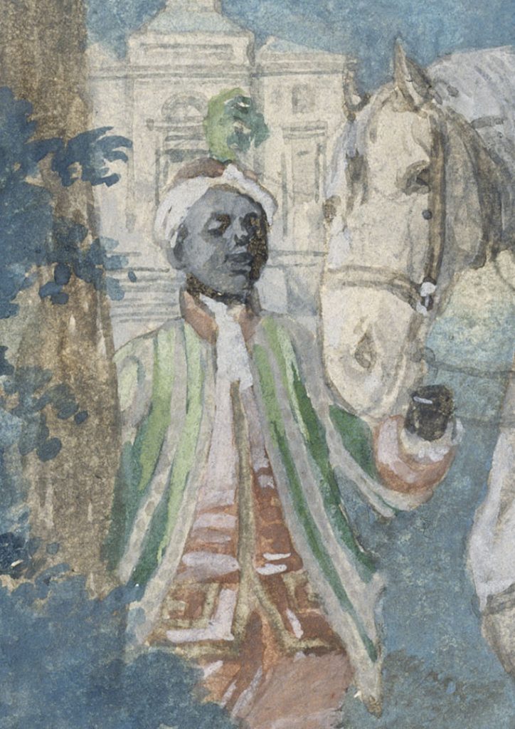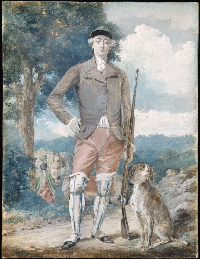 Et pourtant, aucun de ces liens coloniaux n’est mentionné dans l’exposition. Une fois de plus, cela ressemble à une occasion manquée pour ces musées d’art : celle de prendre part aux débats publics sur le passé colonial de la France et d’enrichir l’histoire nationale française de perspectives nouvelles. Pour nous, la frustration s’est cristallisée devant un portrait à la gouache d’Artois en chasseur, accompagné d’un serviteur noir, probablement réduit en esclavage. Au lieu de mettre en évidence la présence de ce jeune homme noir et de mobiliser le portrait pour aborder l’exploitation de la main-d’œuvre noire par le comte (à Saint-Domingue et à Paris), le cartel semblait s’employer à évacuer autant que possible toute dimension raciale. Le garçon noir n’y est décrit que comme un « jeune page », et l’interprétation se concentre sur le « loisir favori » d’Artois, la chasse, représentée ici dans le parc du château de Bagatelle, l’une de ses folies architecturales les plus notoires. Une étiquette murale supplémentaire destinée aux enfants les encourageait à « regarder bien » pour repérer le cheval à l’arrière-plan, sans mentionner le jeune homme noir tenant les rênes de l’animal – qui pourrait d’ailleurs bien être la personne désignée comme un « nègre  , et uniquement ainsi, dans les registres comptables des écuries du comte. Même lorsque l’implication directe et problématique d’Artois dans l’esclavage colonial est aussi manifestement visible, comme dans ce type de portrait, le silence des conservateur·rices persiste.