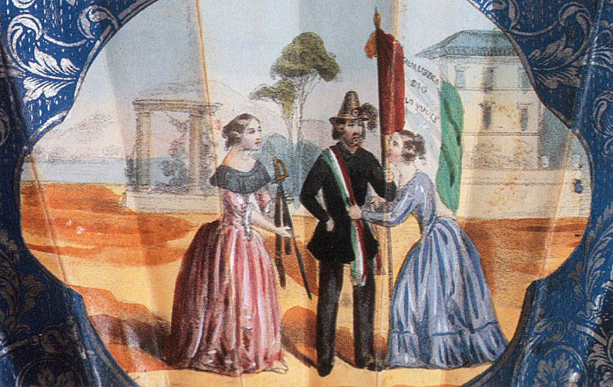 De même, on peut déduire que les objets célébrant le pape Pie IX comme un souverain favorable à l’unification italienne, tels que des médaillons ou des foulards à son effigie, datent des premières années de son pontificat : à partir de 1846, lorsque sa position politique semblait pencher plutôt vers les libéraux, jusqu’à l’octroi d’une constitution en 1848, sous la pression des insurrections. De manière similaire, les objets célébrant Daniele Manin, leader de la révolution vénitienne de 1848-1849 contre les Autrichiens, datent de cette même période et de son direct après coup, lorsque sa figure a été héroïsée par les partisans de l’unification.