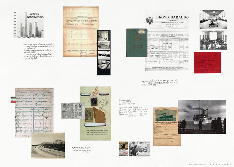 L’idée de transposer mes expériences de vie dans mon œuvre ont été l’une de mes préoccupations essentielles dans Reprises, et sa motivation première était de reconstruire mon histoire familiale. Il s’agit d’un ensemble constitué d’images-textes qui revêt la forme d’une fiction familiale, en retraçant l’itinéraire de mes arrière-grands-parents entre l’Italie et l’Argentine, autour de 1885, en convoquant tout à la fois des documents historiques, des archives familiales, et des photographies que j’ai réalisées en parcourant cet itinéraire, plus d’un siècle plus tard. Mais peut-on revenir aux origines familiales perdues ? Si le passé est dépassé et transformé, comment faire pour le retrouver ? La photographie, à elle seule, peut-elle nous aider à retrouver ou à recréer le lien avec ces origines ?